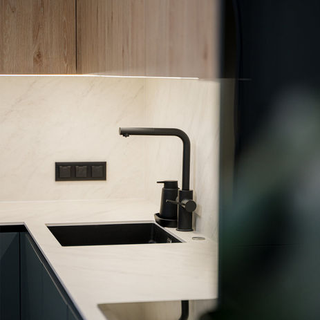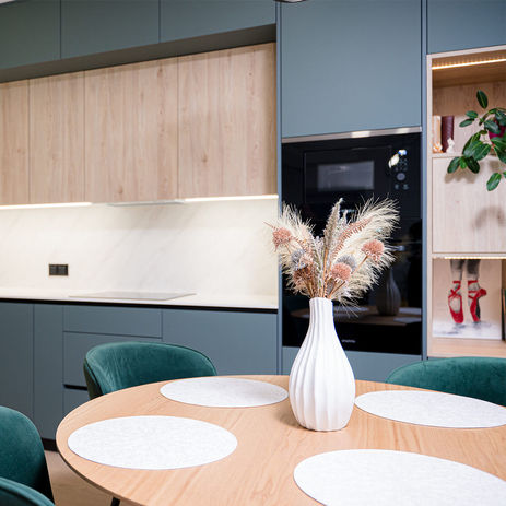 Meža zaļa, L veida virtuves iekārta jaunajā projektā